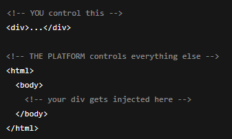 Instead, it injects whatever you write inside an existing page that already has its own <html>, <head>, and <body>.