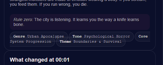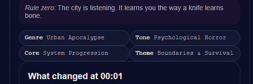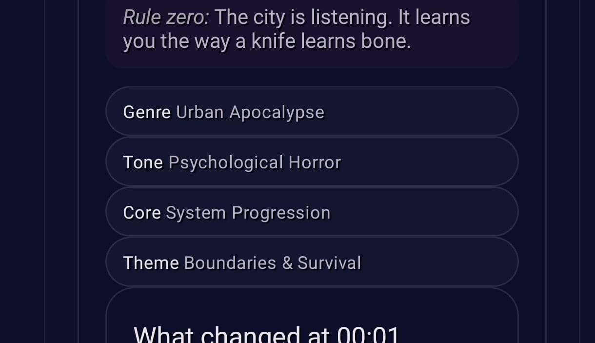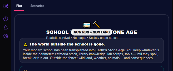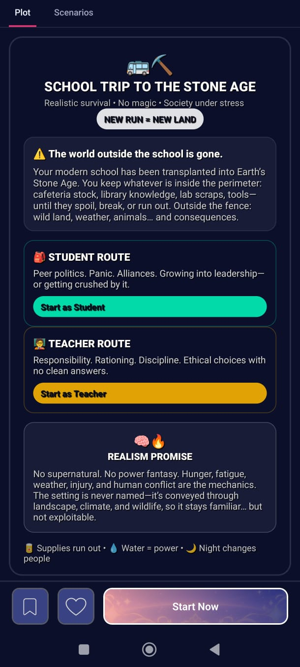 <div style="background:linear-gradient(135deg,#0b1020 0%,#1b2a3a 45%,#2a1b3a 100%);border:2px solid rgba(255,255,255,.12);border-radius:18px;padding:18px 18px 14px;box-shadow:0 10px 28px rgba(0,0,0,.35);font-family:system-ui,-apple-system,Segoe UI,Roboto,Arial;line-height:1.25;"> <div style="display:flex;align-items:center;gap:10px;margin-bottom:10px;"> <div style="font-size:26px;">🚌⛏️</div> <div style="flex:1;"> <div style="font-size:18px;font-weight:800;color:#ffffff;letter-spacing:.2px;"> SCHOOL TRIP TO THE STONE AGE </div> <div style="font-size:12px;color:rgba(255,255,255,.72);margin-top:2px;"> Realistic survival • No magic • Society under stress </div> </div> <div style="font-size:12px;font-weight:700;color:#0b1020;background:rgba(255,255,255,.88);padding:6px 10px;border-radius:999px;"> NEW RUN = NEW LAND </div> </div> <div style="background:rgba(255,255,255,.06);border:1px solid rgba(255,255,255,.12);border-radius:14px;padding:12px 12px 10px;margin-bottom:12px;"> <div style="color:#fff;font-weight:800;font-size:14px;margin-bottom:6px;"> ⚠️ The world outside the school is gone. </div> <div style="color:rgba(255,255,255,.78);font-size:13px;"> Your modern school has been transplanted into <b>Earth’s Stone Age</b>. You keep whatever is inside the perimeter: cafeteria stock, library knowledge, lab scraps, tools—until they spoil, break, or run out. Outside the fence: wild land, weather, animals… and consequences. </div> </div> <div style="display:grid;grid-template-columns:1fr 1fr;gap:10px;margin-bottom:12px;"> <div style="background:linear-gradient(135deg,rgba(0,255,194,.16),rgba(0,153,255,.10));border:1px solid rgba(0,255,194,.25);border-radius:14px;padding:12px;"> <div style="font-weight:900;color:#ffffff;font-size:14px;margin-bottom:4px;">🎒 STUDENT ROUTE</div> <div style="color:rgba(255,255,255,.82);font-size:12.5px;"> Peer politics. Panic. Alliances. Growing into leadership—or getting crushed by it. </div> <div style="margin-top:8px;font-size:12px;font-weight:800;color:#0b1020;background:rgba(0,255,194,.85);display:inline-block;padding:6px 10px;border-radius:999px;"> Start as Student </div> </div> <div style="background:linear-gradient(135deg,rgba(255,183,0,.16),rgba(255,0,122,.10));border:1px solid rgba(255,183,0,.25);border-radius:14px;padding:12px;"> <div style="font-weight:900;color:#ffffff;font-size:14px;margin-bottom:4px;">🧑🏫 TEACHER ROUTE</div> <div style="color:rgba(255,255,255,.82);font-size:12.5px;"> Responsibility. Rationing. Discipline. Ethical choices with no clean answers. </div> <div style="margin-top:8px;font-size:12px;font-weight:800;color:#0b1020;background:rgba(255,183,0,.88);display:inline-block;padding:6px 10px;border-radius:999px;"> Start as Teacher </div> </div> </div> <div style="background:rgba(255,255,255,.06);border:1px dashed rgba(255,255,255,.22);border-radius:14px;padding:12px;margin-bottom:12px;"> <div style="display:flex;align-items:center;gap:8px;margin-bottom:6px;"> <div style="font-size:18px;">🧠🔥</div> <div style="font-weight:900;color:#ffffff;font-size:13px;">REALISM PROMISE</div> </div> <div style="color:rgba(255,255,255,.78);font-size:12.5px;"> No supernatural. No power fantasy. Hunger, fatigue, weather, injury, and human conflict are the mechanics. The setting is <b>never named</b>—it’s conveyed through landscape, climate, and wildlife, so it stays familiar… but not exploitable. </div> </div> <div style="display:flex;gap:10px;flex-wrap:wrap;align-items:center;justify-content:space-between;"> <div style="color:rgba(255,255,255,.75);font-size:12px;"> 🥫 Supplies run out • 💧 Water = power • 🌙 Night changes people </div>
