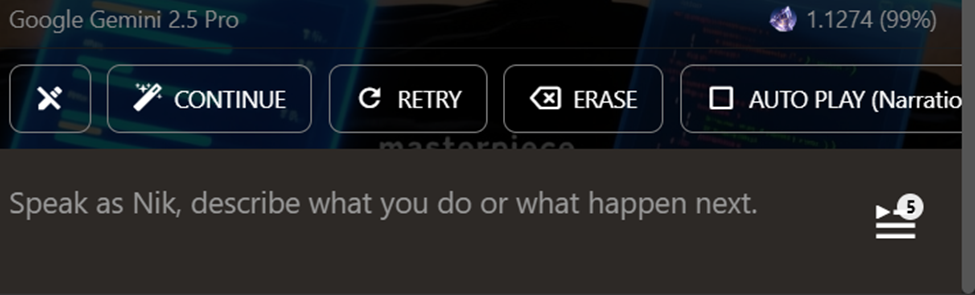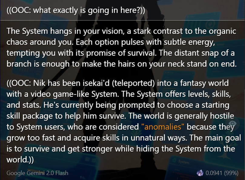 Sometimes we can get a little lost in the story, or forget where we left off, who an important character was, exactly how the magic system in the story was playing works exactly. It happens, there are a lot of different worlds to keep track of and it can be a hassle having to go back and re-read stuff just to catch back up. This is where OOC comes in handy. OOC is “Out of Character,” and is basically the command you can use to talk to the AI directly. Think of it as asking the DM a question.