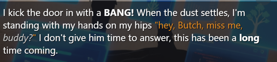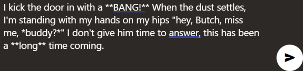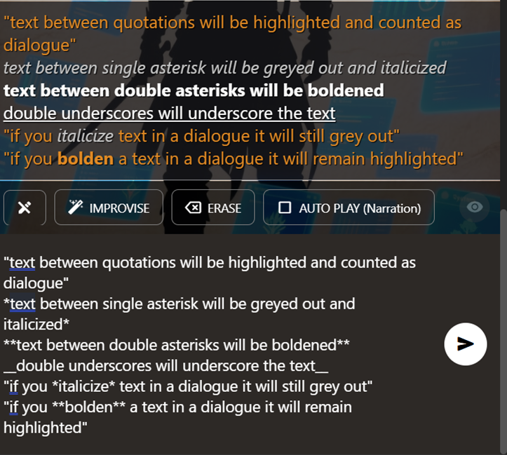 Your dialogue should always be between quotation (“ ”) marks; this lets the AI know what your character is saying, vs what they are doing. It also makes it easier to read because all dialogue is highlighted (the orange-colored text).