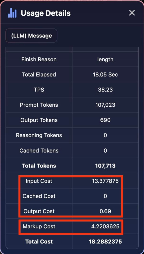 - Base Cost - Each AI response has an input cost and output cost (visible in Usage Details)